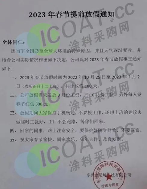 東莞某工廠:由于國內乃至全球大環(huán)境等特殊原因,公司決定提前放春假,共計100天。