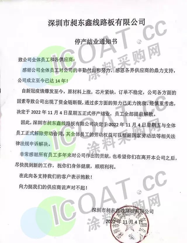 深圳市昶東鑫線路板有限公司:決定于2022年11月4日正式停產結業(yè),員工全部提前解散。