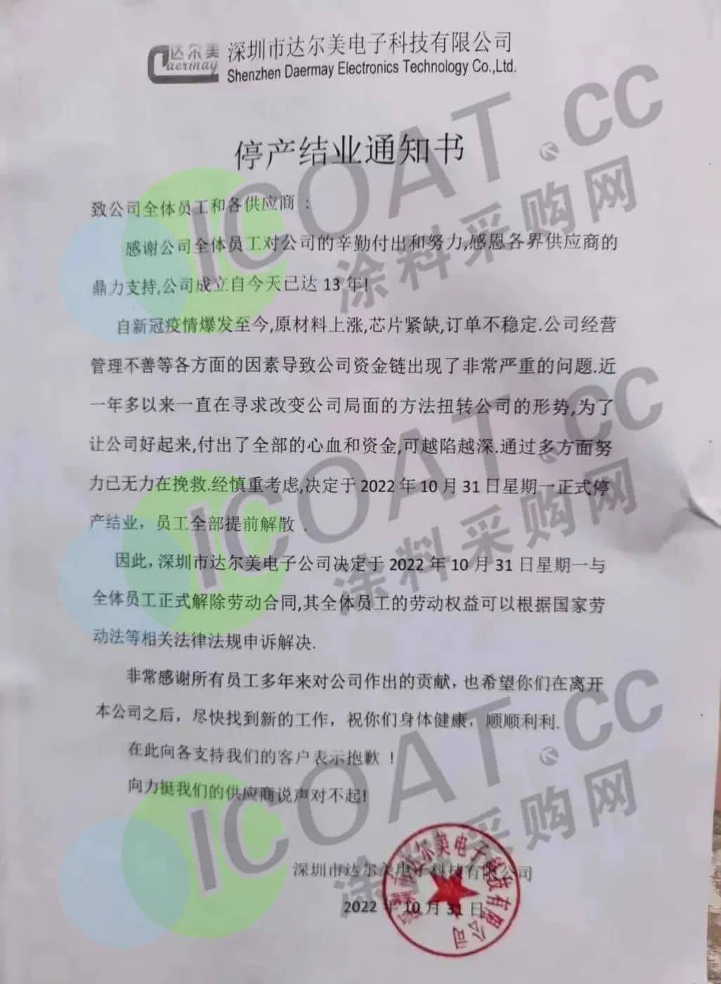 13年LED驅動電源廠深圳市達爾美電子科技有限公司:決定于2022年10月31日正式停產結業(yè),員工全部提前解散。