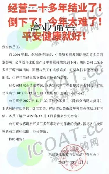 經(jīng)營了20多年的東莞競業(yè)塑膠五金制品有限公司:12月1日正式停產結業(yè),企業(yè)將于2022年11月30日與全體員工正式解除勞動關系,各員工請于12月3日前搬離公司宿舍。