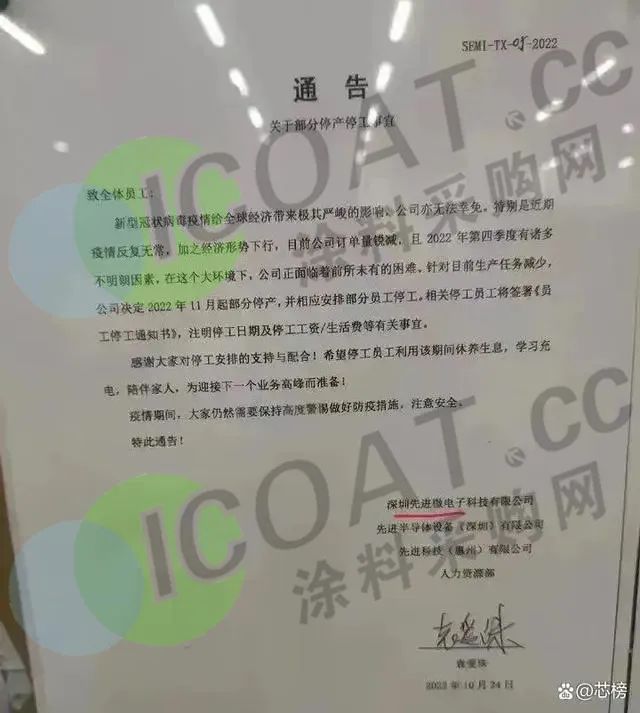 深圳先進微電子等3家半導體設備大廠:由于新冠疫情和經(jīng)濟形勢下行,公司訂單量銳減,決定自11月起部分停產并安排部分員工停工。
