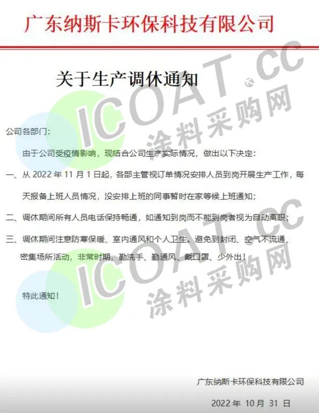 廣東納斯卡環(huán)保科技有限公司:從2022年11月1日起,各部主管視訂單情況安排人員到崗開展生產工作,每天報備上班人員情況,沒安排上班的同事暫時在家等候上班通知。
