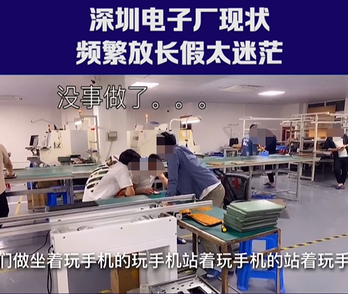 廣東深圳多家電子廠頻繁放長假,工廠沒訂單,機器設備已經(jīng)停工,人員也聚在一起無事可做。有些是放假一周輪休,有些則是休假者一天補貼20元。