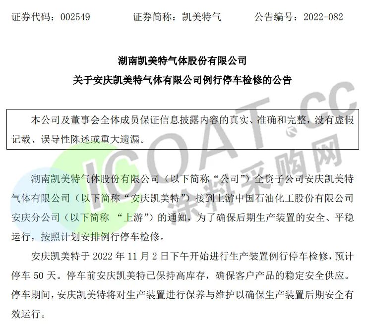 凱美特氣公告,全資子公司安慶凱美特已于11月2日下午開始進行生產裝置例行停車檢修,預計停車50天。