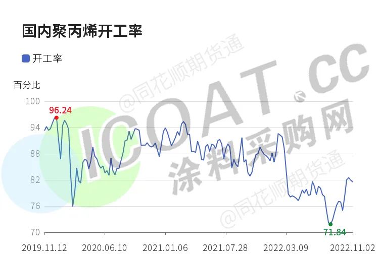 聚丙烯行業(yè),開工率錄得81.50%,較上一周減少0.46%。目前中原石化10萬噸裝置、奢華新疆45萬噸裝置、聯(lián)泓新科8萬噸裝置、青海鹽湖16萬噸裝置、天津渤化30萬噸裝置、洛陽石化9萬噸裝置、天津石化6萬噸裝置、海國龍油35+35萬噸裝置目前處于停車狀態(tài),且重啟時間待定。
