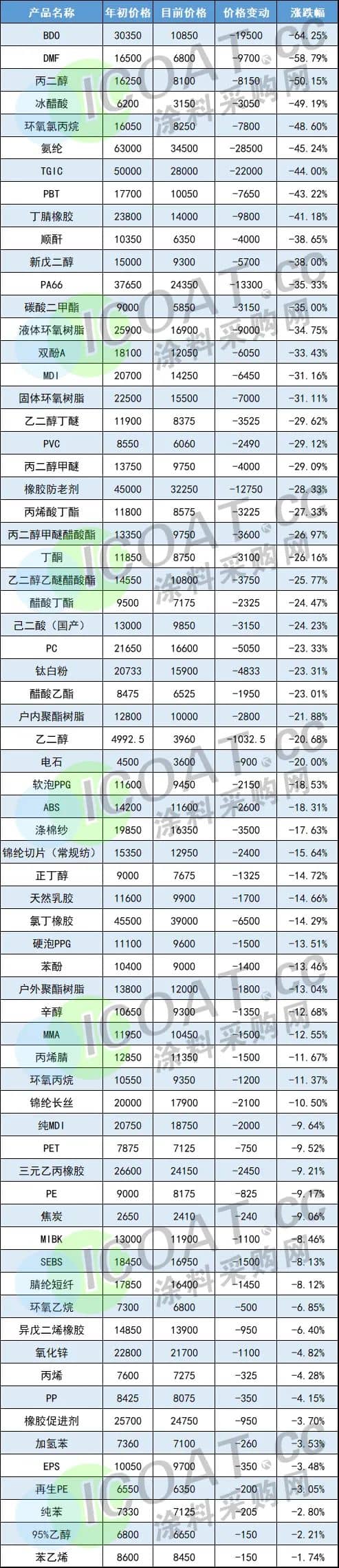 以2022年年初的報價來對比,目前60余種化工品價格出現下跌,其中BDO價格下跌64.25%,DMF、丙二醇等價格下跌超過50%,氨綸、TGIC、PA66等產品噸價下跌超過萬元。