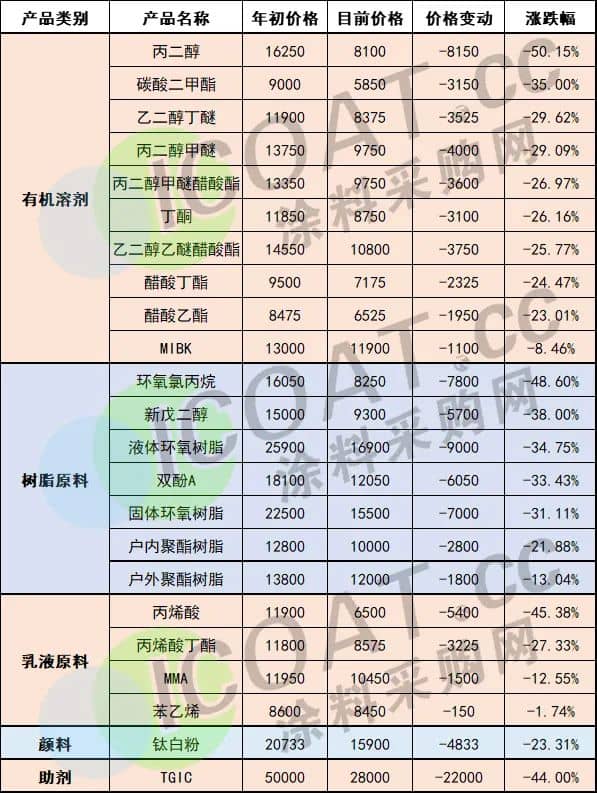 此外,在涂料產業鏈上,上游溶劑、助劑、顏填料、成膜物質等原材料產業鏈也出現了價格下滑的情況。