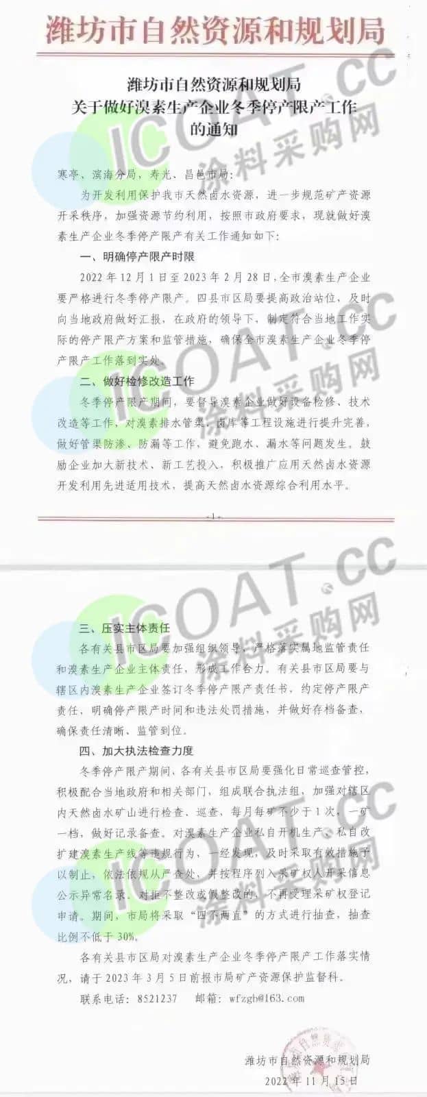 近日,化工重鎮山東濰坊發布通知,為合理保護鹵水資源,實現鹵水資源的有序開采、合理有效利用,決定對全市溴素生產企業進行冬季停產限產,時間為2022年12月1日—2023年2月28日。具體包括寒亭、濱海、壽光和昌邑等全部四個溴素生產集中地。