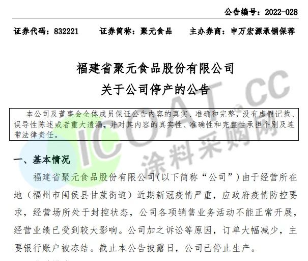聚元食品:由于經營所在地近期新冠疫情嚴重,企業各項銷售業務活動不能正常開展,經營業績已受到較大影響。加之訴訟等原因,訂單大幅減少,主要銀行賬戶被凍結,截止本公告披露日,公司已停止生產。