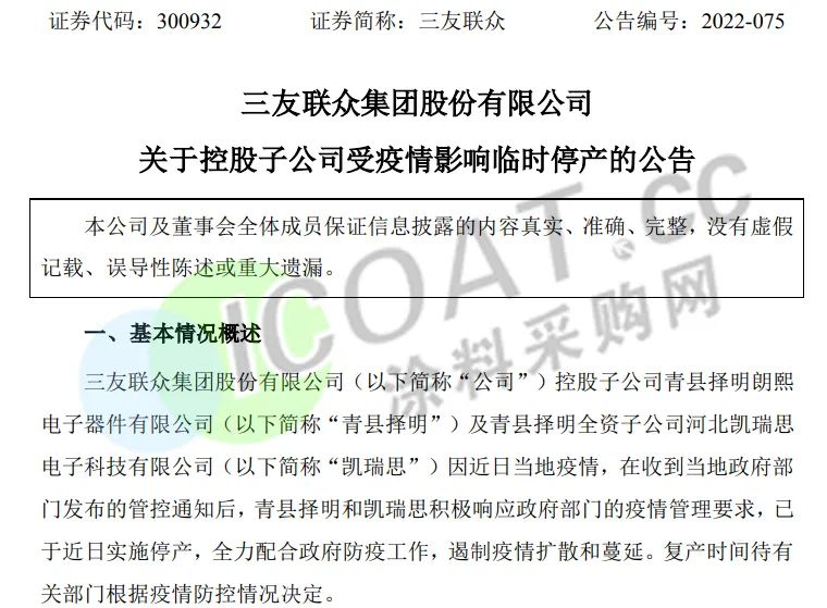 三友聯眾:控股子公司青縣擇明及青縣擇明全資子公司凱瑞思因近日當地疫情,在收到管控通知后,已于近日實施停產,遏制疫情擴散和蔓延。