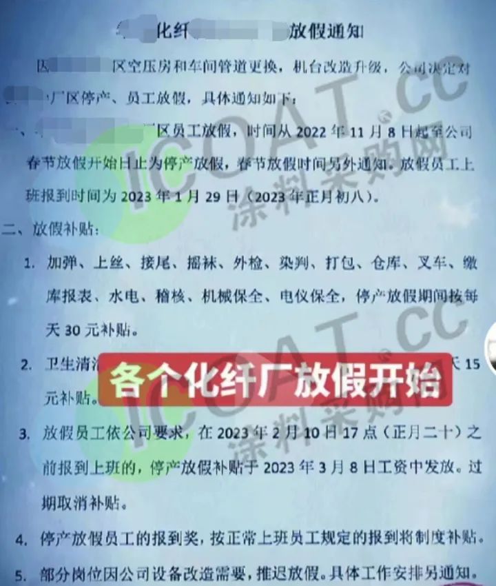 紹興一知名化纖企業通告,某廠區將在2022年11月8號起放假,放假員工上班報到時間為2023年1月29月(2023年正月初八),部分崗位每天給予15~30元補貼。