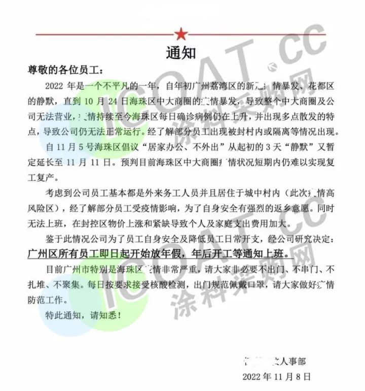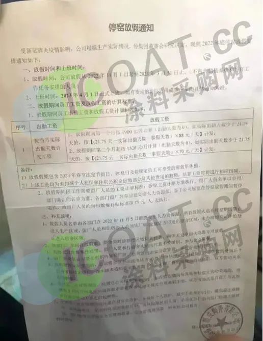 某大型陶企發布放假通知,受新冠肺炎疫情影響,企業從2022年11月1日起至2023年3月31日放假,上班時間為2023年4月1日。放假時間長達5個月。