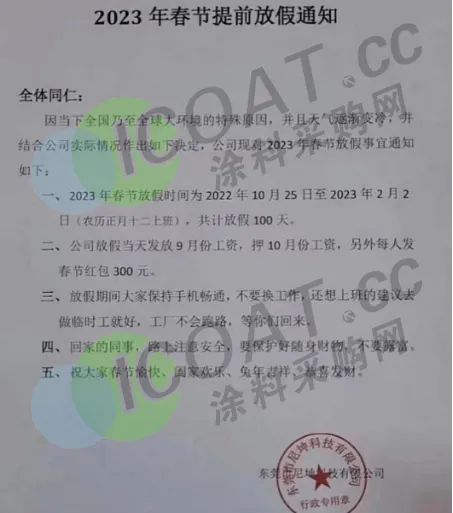 廣州東莞某工廠表示,由于國內及全球大環境等特殊原因,決定2022 年10月25日起開始放假,共計100天。