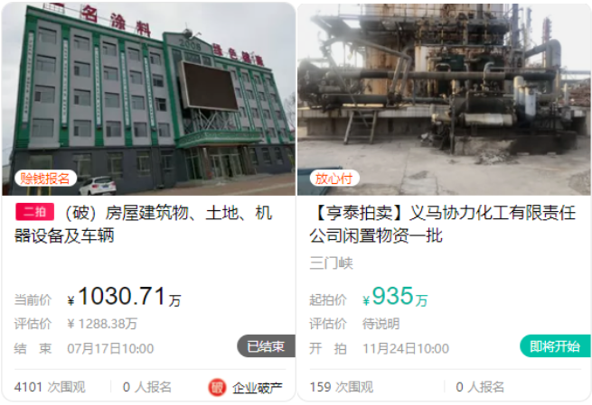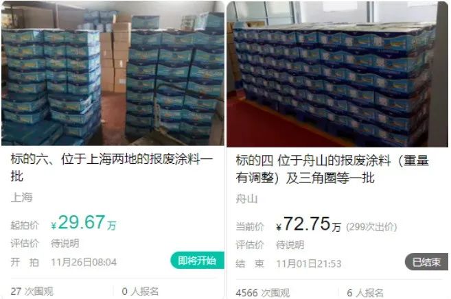 此外法拍的情況也不在少數,這些破產重整的涂料、化工廠或自己選擇變賣財產,或被債權人進行法拍,都走上了一條艱難的路。拍賣的標的包括但不限于涂料、砂漿、膠粘劑等生產線,鐵皮柜、手推車、升降機、塑料桶、電子屏等工廠雜物,以及庫存的涂料產品,甚至還有地毯、工藝品、桌椅和沙發等,值得注意的是,有些企業已經“賒錢”報名了,但仍未拍賣成功,企業最后的一次努力也以失敗告終。