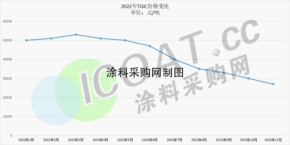 近日,價格持續下滑的TGIC已經跌破了噸價3萬元大關,報價低至27000元/噸,創近十年新低,較年初價格下跌46%,較去年高點68000元/噸左右下跌近60%。