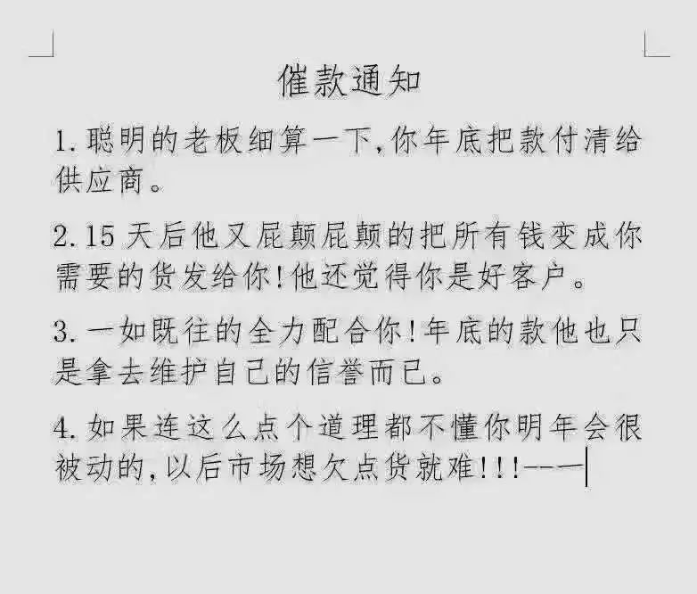 但這種強(qiáng)勢(shì)的“聲明”真的能解決問(wèn)題嗎?每年歲末年初都有很多涂料廠嚴(yán)正發(fā)聲討要貨款,但到底有多少能收回,有多少又從應(yīng)收賬款變成了計(jì)提損失,最后變成了壞賬,我們無(wú)從得知。唯獨(dú)可以確定的是,如果涂料企業(yè)沒(méi)有提升自己的競(jìng)爭(zhēng)力和話語(yǔ)權(quán),地位沒(méi)有提升的話,多少花招也難拿回貨款。