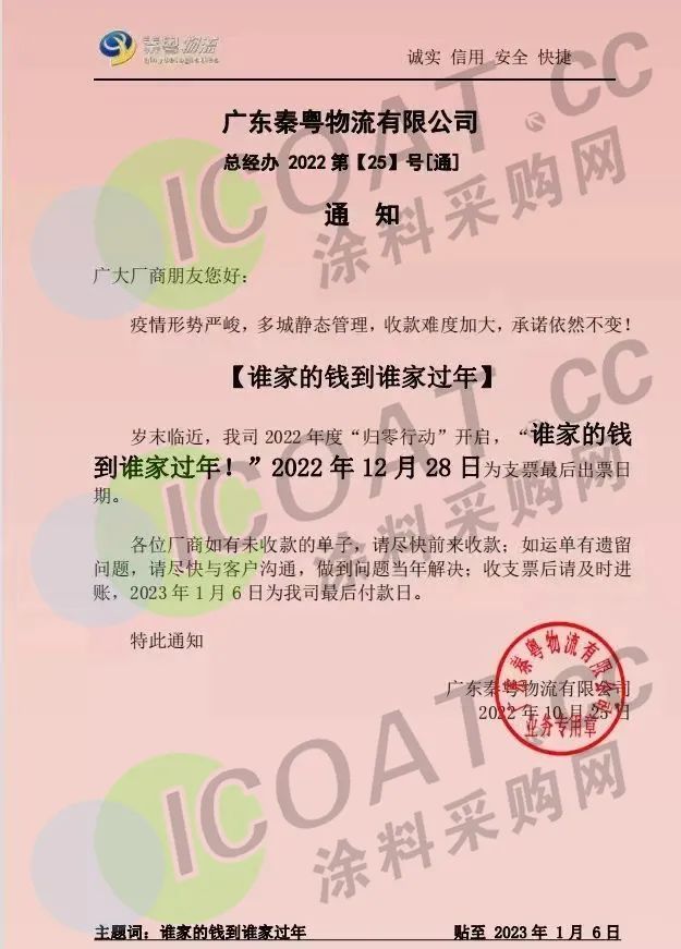 距離春節還有1個多月的時間,但是無論是工廠還是物流企業,都已經吹響了“春節假期”的號角。近日,廣東秦粵物流發布《通知》,稱歲末臨近,“歸零行動”開啟,2022年12月28日為支票最后出票日期。各位廠商如有未收款的單子,請盡快前來收款;收支票后請及時進賬,2023年1月6日為最后付款日。