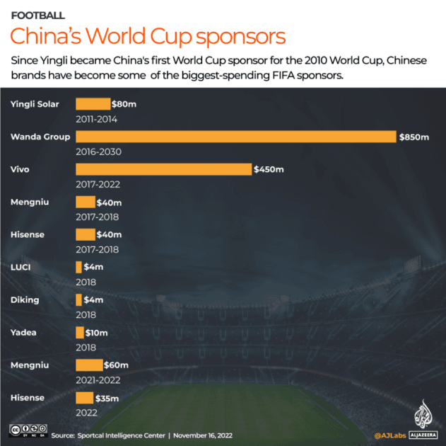 迄今為止,萬達集團是卡塔爾世界杯最大的中國贊助商,萬達集團承諾為世界杯投資8.5億美元(約合人民幣60億元),作為與FIFA協議的一部分。2016年,萬達集團簽約成為了FIFA官方合作伙伴,協議時長為15年。