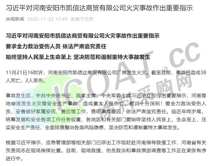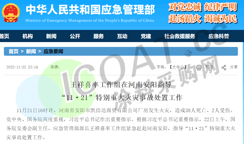 根據(jù)重要指示,國務(wù)院安委會副主任、應(yīng)急管理部部長王祥喜率工作組緊急趕赴河南安陽,指導(dǎo)“11·21”特別重大火災(zāi)事故處置工作。