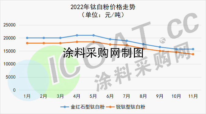 國內銳鈦型鈦白粉主流商談參考區間在14500元/噸,實際成交價格多在13800元/噸及以下。較年內高值下跌4750元/噸,跌幅25.68%,較去年高值19500元/噸下跌5750元/噸,跌幅41.82%。