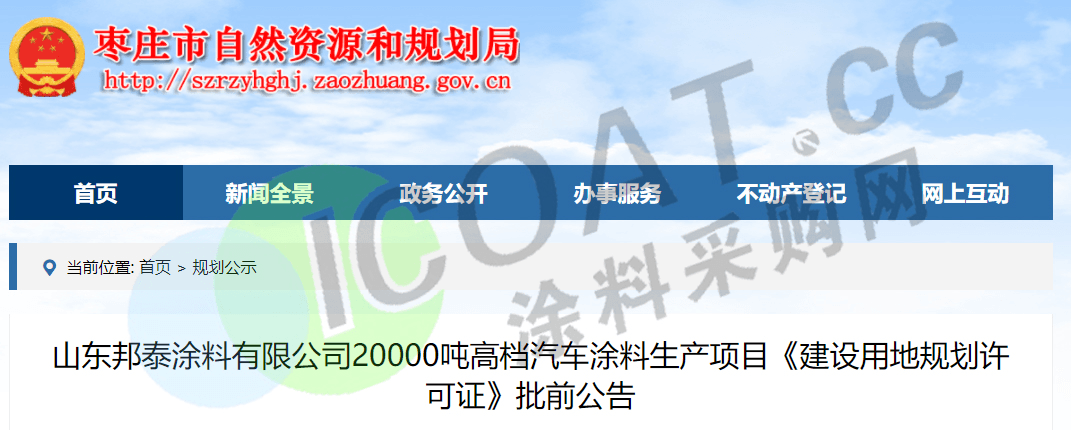山東邦泰涂料20000噸高檔汽車涂料生產項目《建設用地規劃許可證》批前公告。