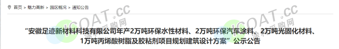 安徽足跡新材料年產2萬噸環保水性材料、2萬噸環保汽車涂料、2萬噸光固化材料、1萬噸丙烯酸樹脂及膠粘劑項目規劃建筑設計方案公示公告。
