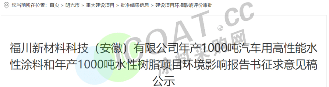 福川新材料科技(安徽)年產1000噸汽車用高性能水性涂料和年產1000噸水性樹脂項目環境影響報告書征求意見稿公示。
