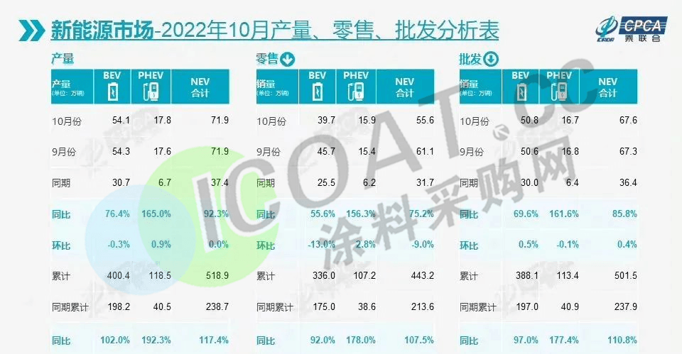 近年來,國內新能源汽車的迅猛發展,讓很多涂料企業看到了機會。今年1月至10月,國內乘用車市場共銷售1671.6萬輛汽車,同比增長3%;新能源車國內銷售443.2萬輛,同比增長107.5%。10月份新能源車的滲透率首次突破30%,銷量達到55.6萬輛,同比增長75.2%。