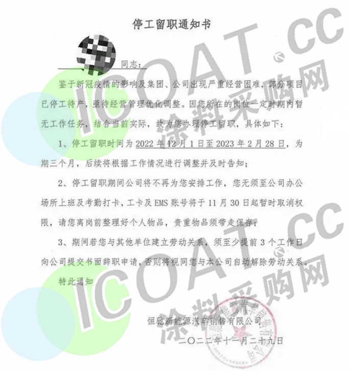 12月1日,全國多地多家恒馳展廳銷售人員爆料,已接到“停工留職通知書”,據該通知內容顯示,由于近期經營出現嚴重困難,公司將對人員進行優化,將從12月1號起對其進行長達3個月的停工留職。