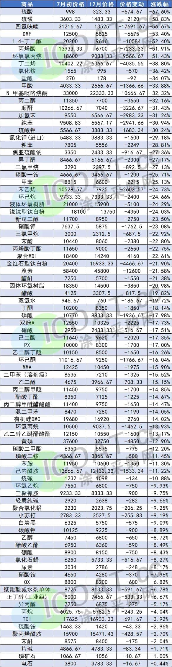 1,4-丁二醇12月初報價9616元/噸,較7月初價格下跌10584元/噸,跌幅52.40%;