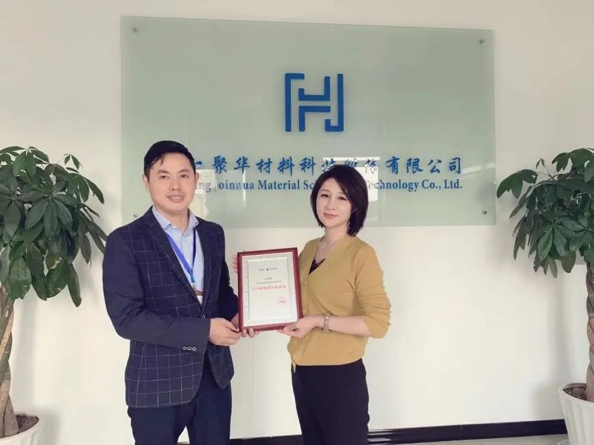 涂料采購網市場部總監張馨元(右)與聚華材料董事長張慶華(左)合影