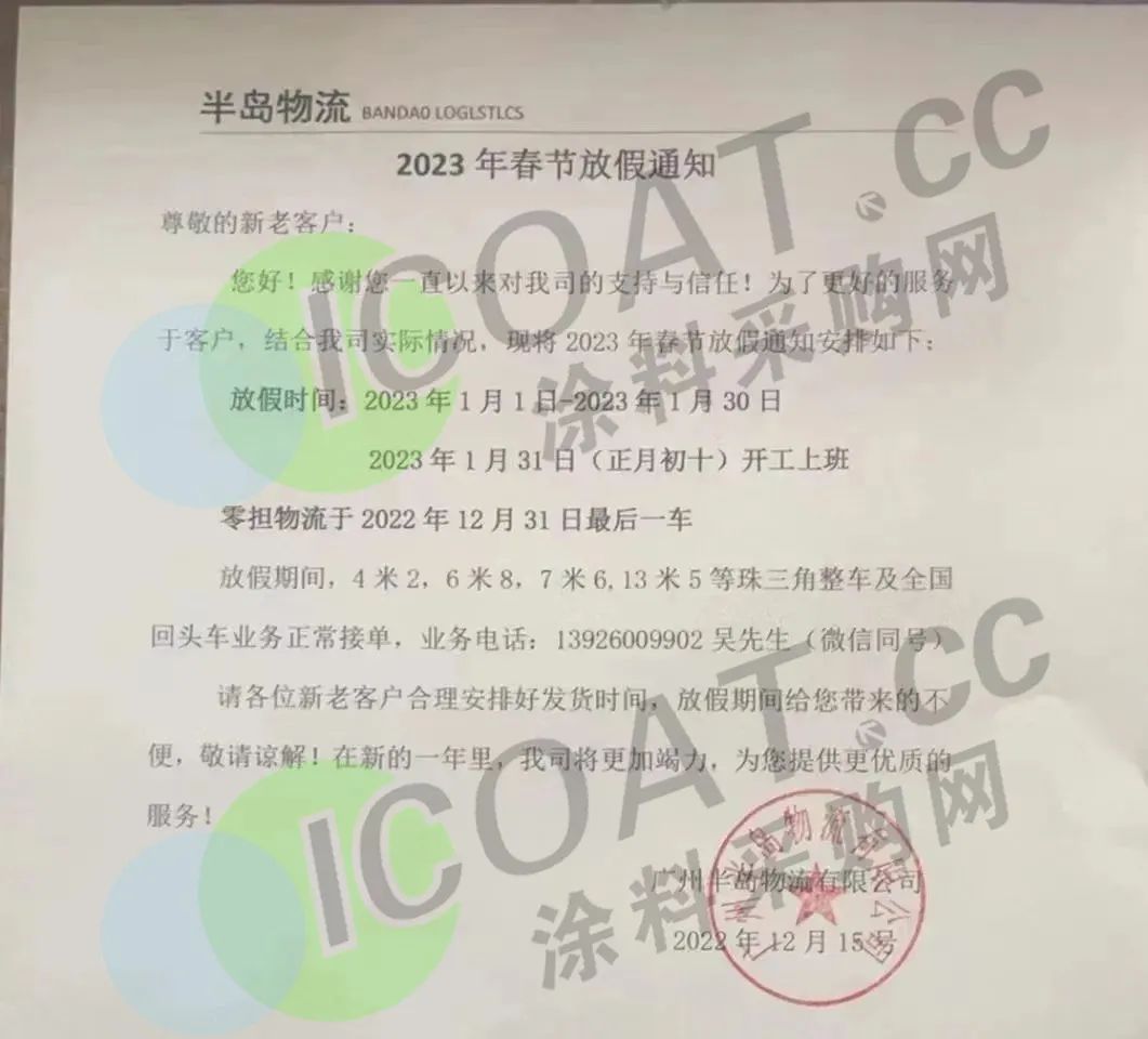 從以上各物流公司消息看,不少物流公司宣布在1月初便開始放假,更有甚至宣布放兩個月的假,某大型零擔(dān)公司春節(jié)放假時間是2023年1月1日至2023年2月28日,相當(dāng)于直接停運(yùn)兩個月!物流的停運(yùn)也在無聲宣告著,涂料、化工等工業(yè)企業(yè)將提前結(jié)束一年的運(yùn)營,開啟春運(yùn)返鄉(xiāng)潮。