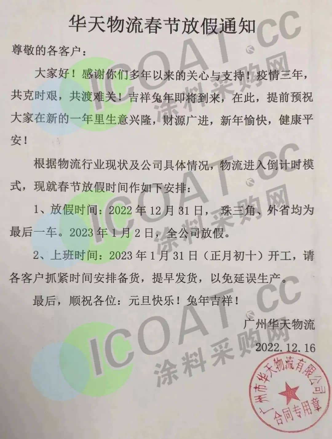 盡管歷年的放假基本都是從1月開始,但今年疫情肆虐,陽性感染者暴增,多個行業(yè)開開停停之下也選擇了放假的選項(xiàng),以解決成本高企等問題。涂料采購網(wǎng)提醒大家,在歸家休假的同時也要安排好企業(yè)的生產(chǎn)計(jì)劃,合理備貨,以免出現(xiàn)貨源短缺或訂單延誤等情況。