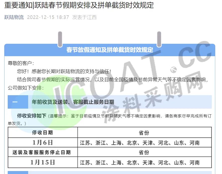 躍陸物流:1月6日停收江蘇、浙江、上海、北京、天津、河北、山東、河南等地的貨物。1月15日以上地區(qū)的送裝及客服服務(wù)停止。