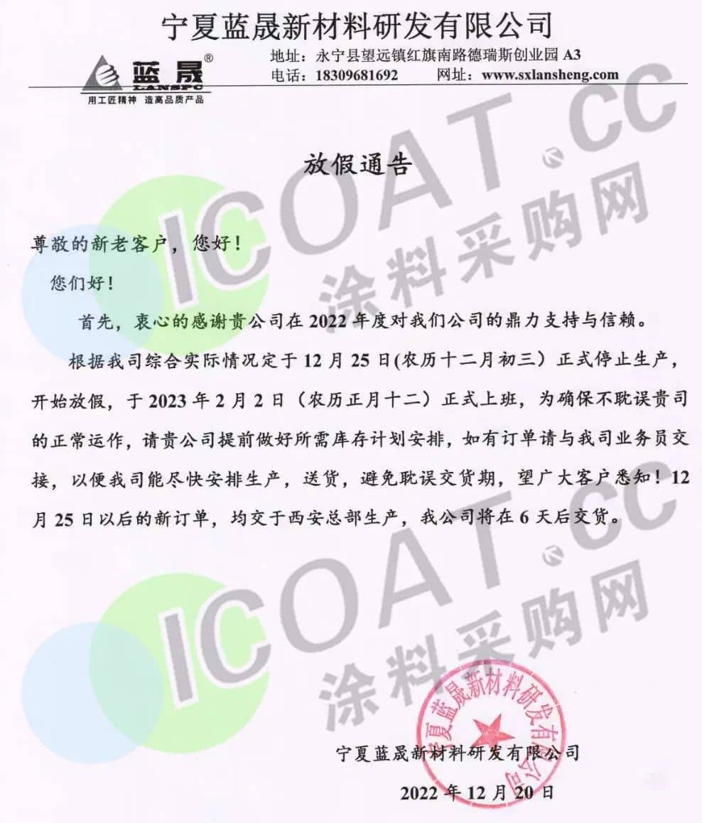 寧夏藍(lán)晟新材料研發(fā)有限公司:定于12月25日正式停止生產(chǎn)開始放假,于2023年2月2日正式上班。12月25日以后的新訂單,均交于西安總部生產(chǎn),企業(yè)將在6天后交貨。