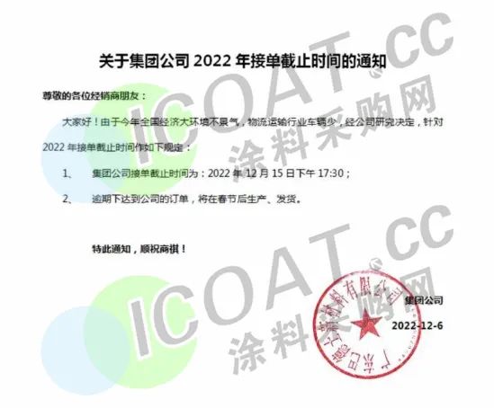 金展鴻漆:水性車間2022年12月25日暫停接單,12月30日暫停發(fā)貨。油性車間2022年12月31日暫停接單,2023年1月7日暫停發(fā)貨,2023年1月8日-2月2日放假,開工時間為2023年2月3日。