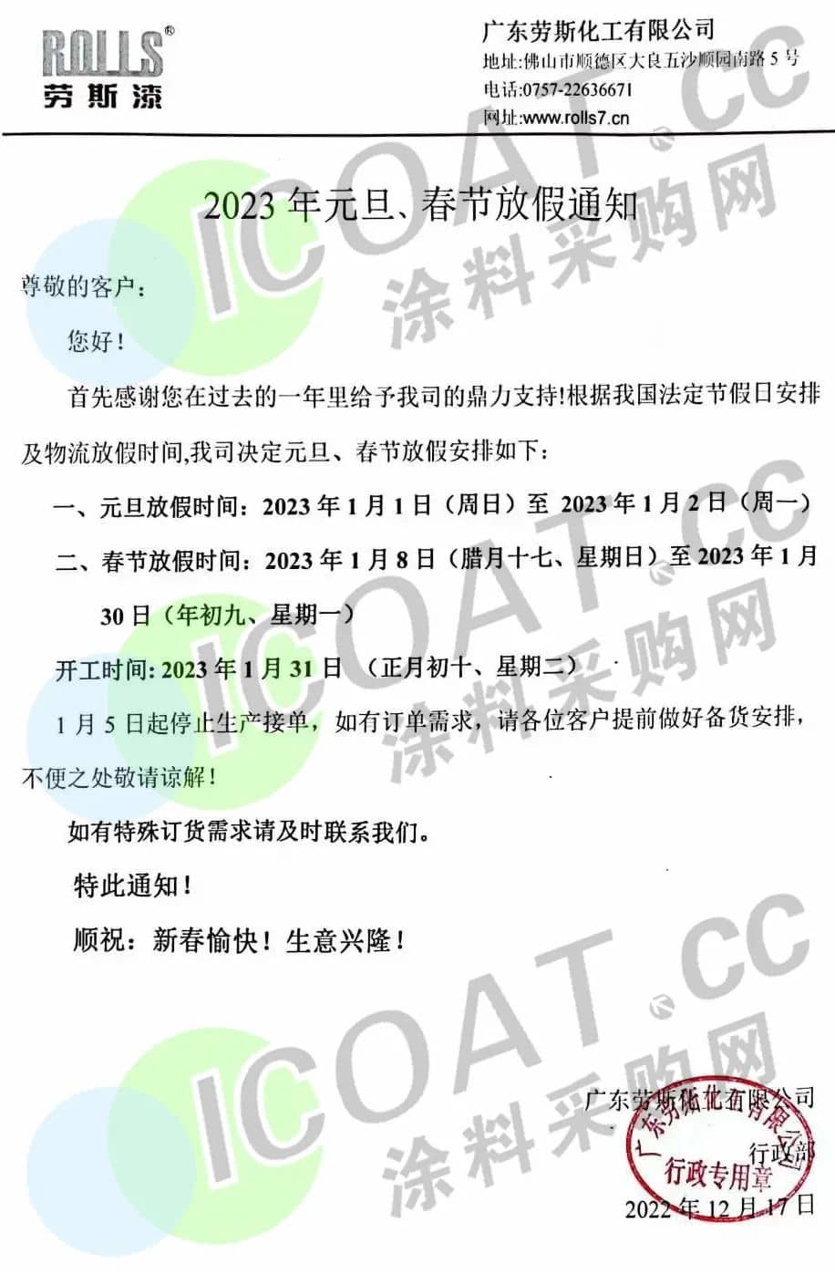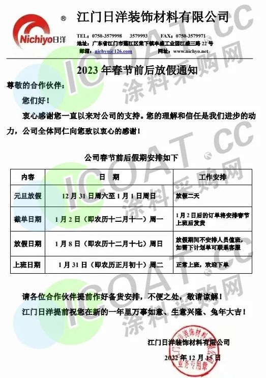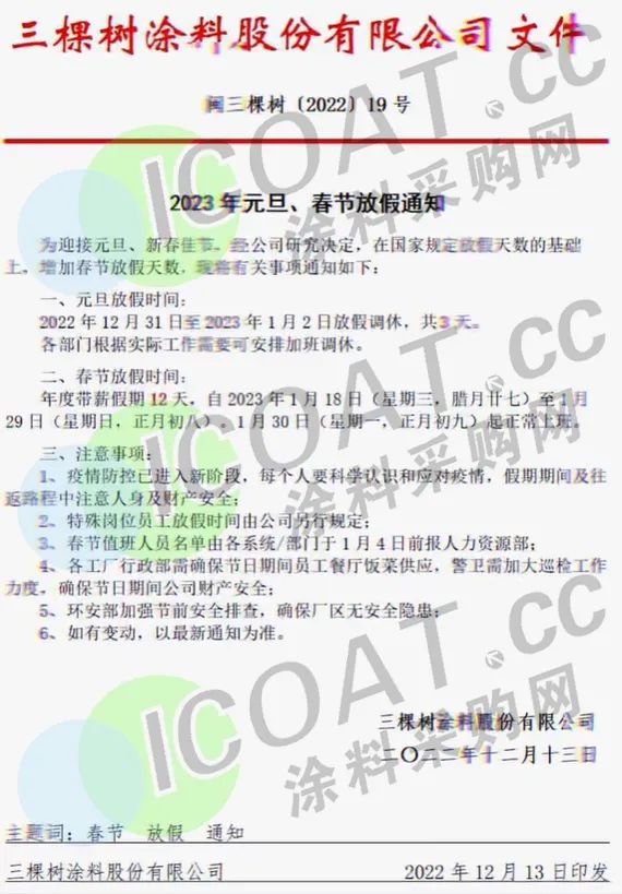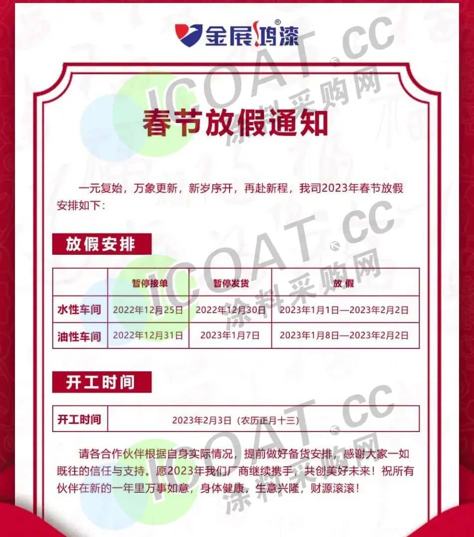 隨著2022年步入尾聲,元旦和春節(jié)的腳步也越來越近,三棵樹、巴德士、藍(lán)晟新材料、金展鴻等幾十家涂料企業(yè)紛紛發(fā)布放假通知,有些春節(jié)假期甚至從2022年一直延續(xù)到2023年,變成了跨年的假期。