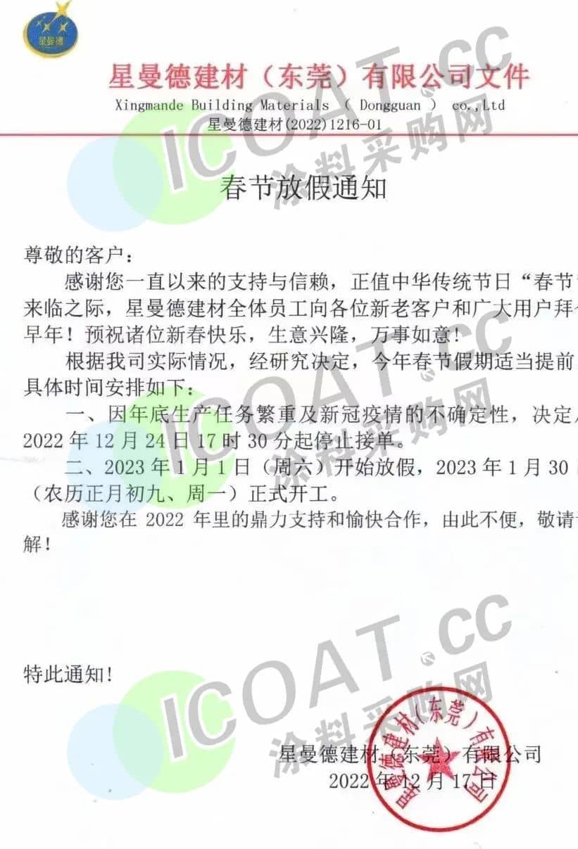 星曼德建材(東莞):決定12月24日17時30分停止接單,2023年1月1日至1月29日放假,1月30日上班。