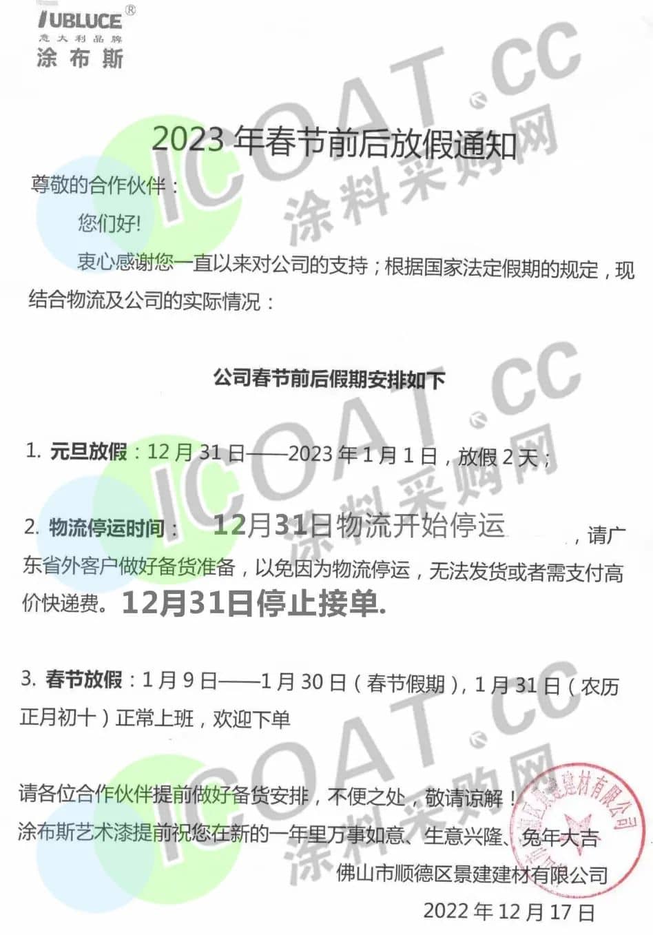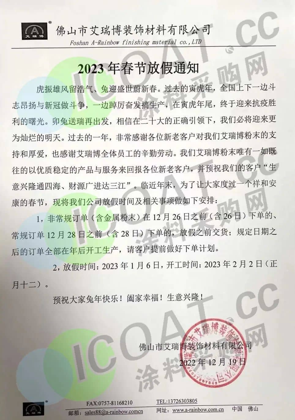 佛山市艾瑞博裝飾材料:非常規(guī)訂單(含金屬粉末)在12月26日之前(含26日)下單的,常規(guī)訂單12月28日之前(含28日)下單的,放假之前交貨,之后的訂單全部在年后開工生產(chǎn)。放假時間為2023年1月6日,開工時間為2023年2月2日。