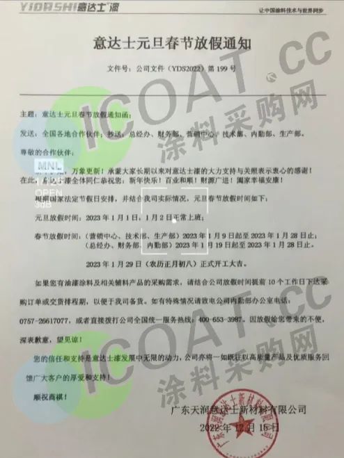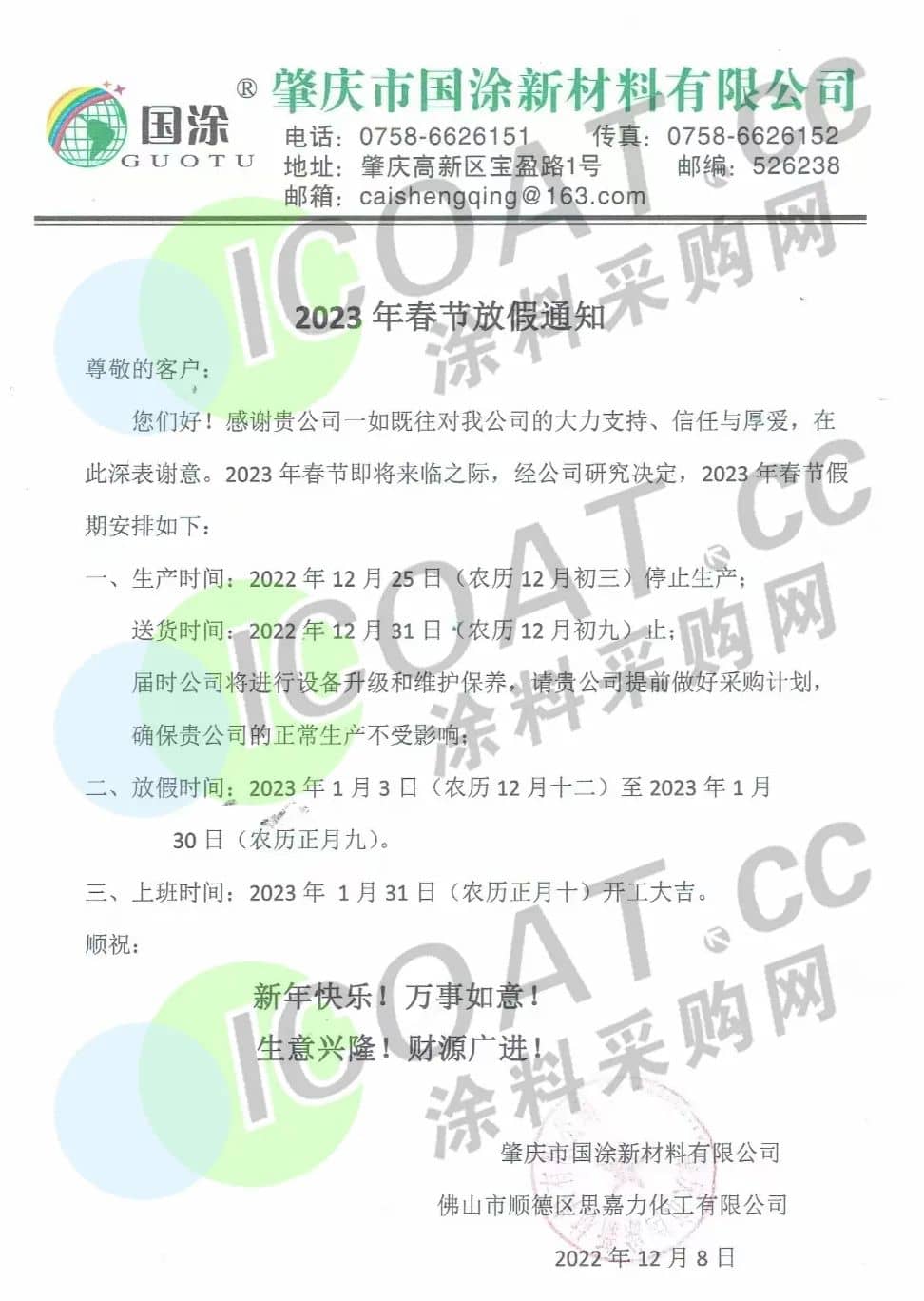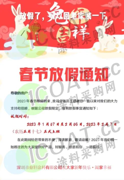 深圳市鼎軒涂料:2023年1月7日至2月6月放假,2023年2月7日正式上班。