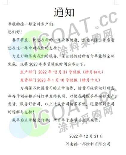 河南德一邦涂料:生產(chǎn)部門2022年12月31號放假,發(fā)貨部門2023年1月10號放假。截單后正常接受訂單,所有單子春節(jié)后生產(chǎn)發(fā)貨。