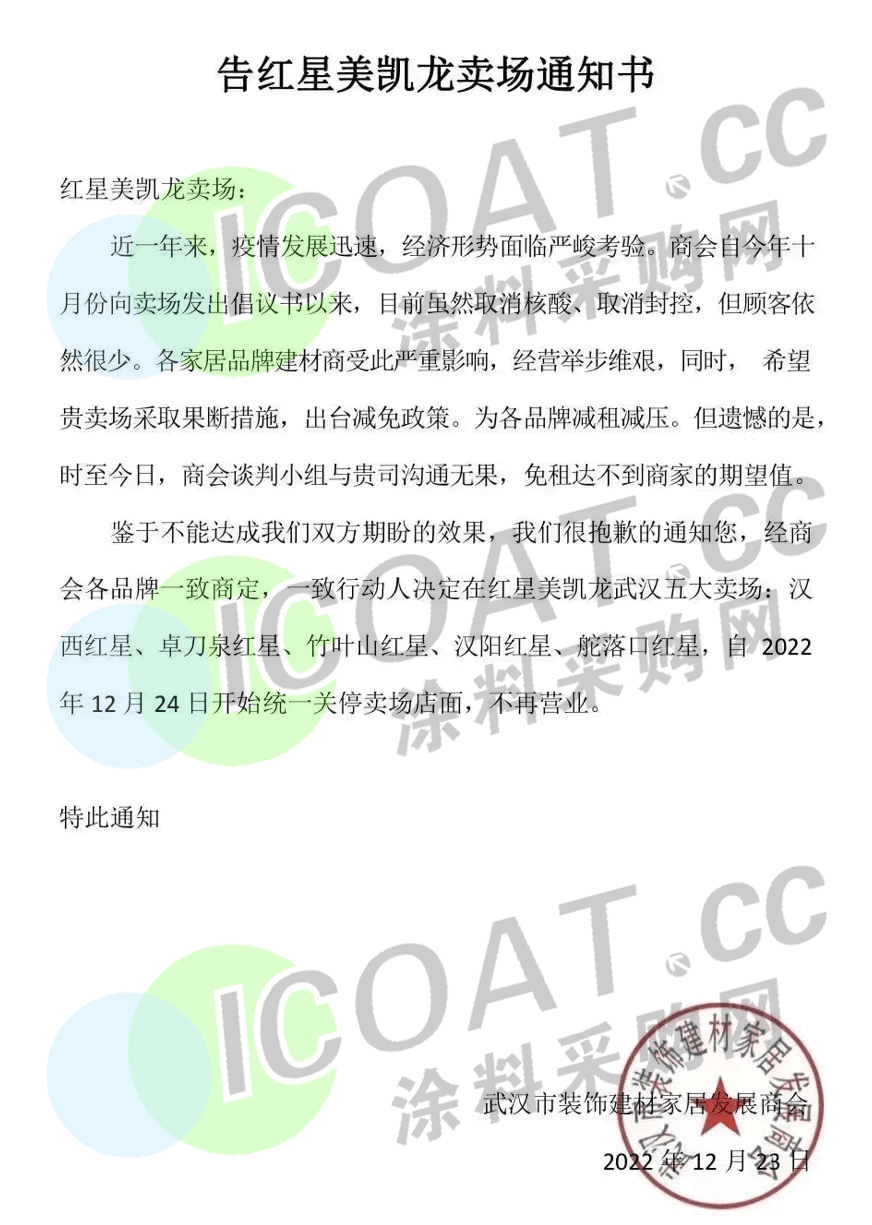 但遺憾的是,時至今日,商會談判小組與貴司溝通無果,免租達(dá)不到商家的期望值。鑒于不能達(dá)成我們雙方期盼的效果,經(jīng)商會各品牌一致商定,一致行動人決定在紅星美凱龍武漢五大賣場:漢西紅星、卓刀泉紅星、竹葉山紅星、漢陽紅星、舵落口紅星,自2022年12月24日開始統(tǒng)一關(guān)停賣場店面,不再營業(yè)。