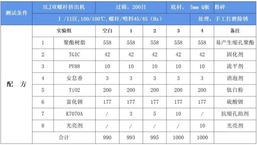 研發(fā)人員經(jīng)過(guò)多番實(shí)驗(yàn)驗(yàn)證了K7070A具有良好的抗縮孔性能,而且對(duì)于粉末其他性能幾乎沒(méi)有影響??蒲械镊攘υ谟诓粩嗵剿?,隨之而來(lái)的是研發(fā)人員產(chǎn)生了新的疑問(wèn)即:添加了K7070A的粉末涂料,會(huì)不會(huì)對(duì)其他未添加K7070A的粉末涂料或者添加光亮劑的粉末涂料產(chǎn)生影響呢?為了解開(kāi)迷津他們進(jìn)一步設(shè)計(jì)了獨(dú)特的實(shí)驗(yàn)思路,探究K7070A能否與空白粉末、光亮劑“和平共處”。