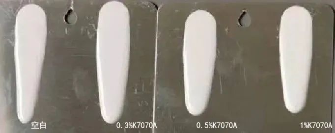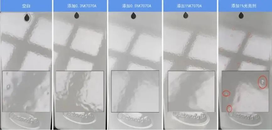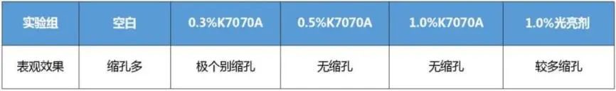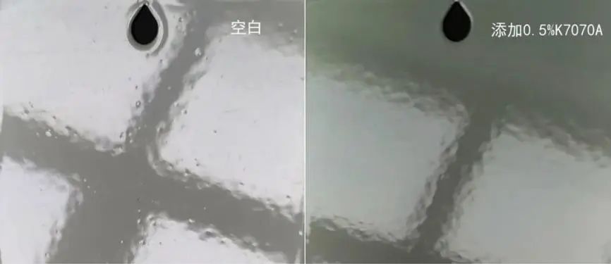 考慮到普通的低成本聚酯在應(yīng)用過(guò)程中容易出現(xiàn)縮孔、針孔,捷通達(dá)的研發(fā)人員以此類樹(shù)脂作為實(shí)驗(yàn)基料考查K7070A的抗縮孔性能。實(shí)驗(yàn)結(jié)果顯示,當(dāng)科研人員把K7070A的添加量0.3%調(diào)整為0.5%時(shí),縮孔逐漸消失,表觀效果優(yōu)異。此外,添加1.0%的K7070A相較于添加等量的光亮劑,縮孔問(wèn)題可以被完全解決。