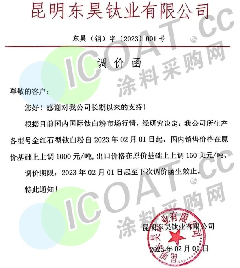 昆明東昊鈦業(yè)發(fā)布調(diào)價函,稱2023年2月1日起,國內(nèi)銷售價格在原價基礎(chǔ)上上調(diào)1000元/噸,出口價格在原價基礎(chǔ)上上調(diào)150美元/噸。