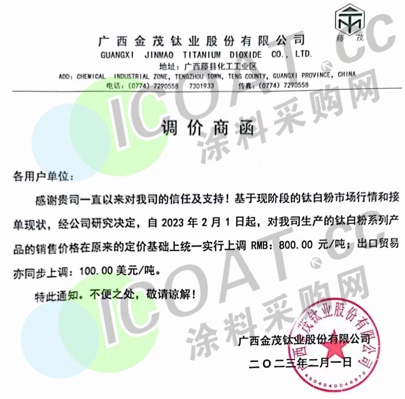 廣西金茂鈦業(yè)發(fā)布調(diào)價商函,稱自2023年2月1日起,對鈦白粉系列產(chǎn)品的銷售價格在原來的定價基礎(chǔ)上統(tǒng)一實行上調(diào)800元/噸;出口貿(mào)易亦同步上調(diào)100美元/噸。