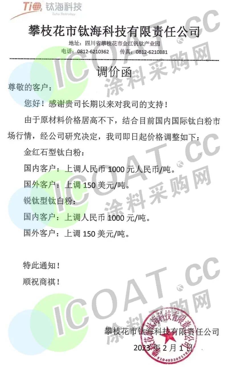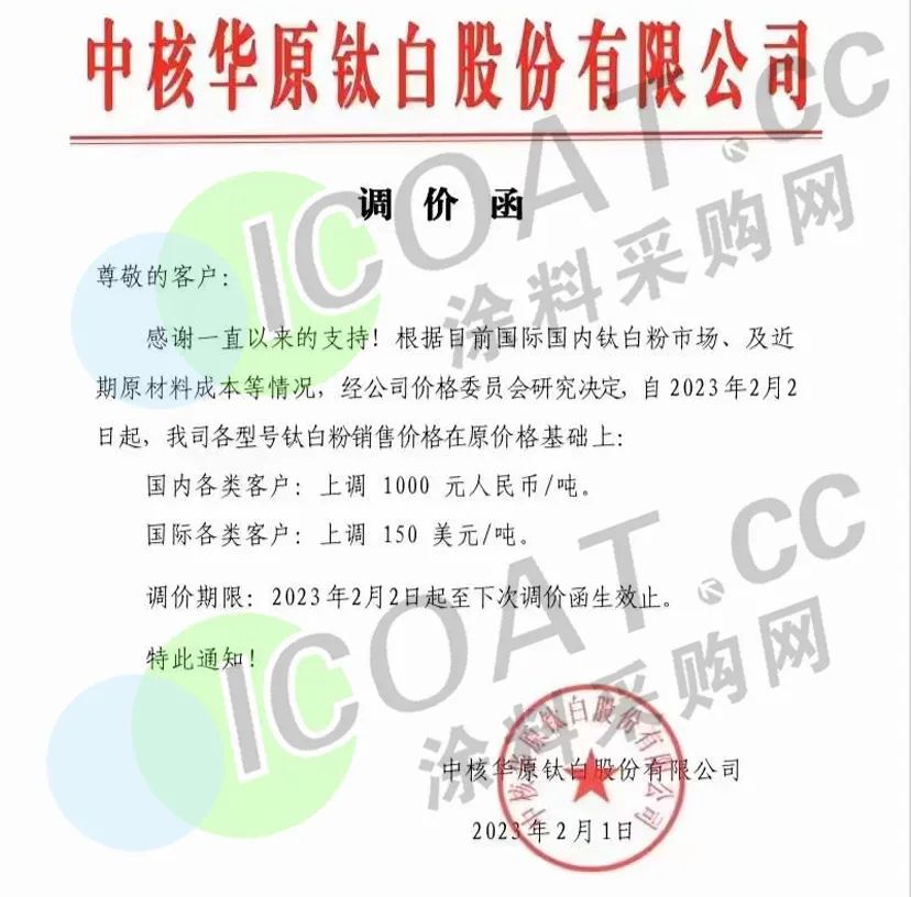 中核華原鈦白發(fā)布調(diào)價函,稱自2023年2月2日起,各型號鈦白粉銷售價格在原價格基礎(chǔ)上:國內(nèi)各類客戶上調(diào)1000元/噸,國際各類客戶上調(diào)150美元/噸。