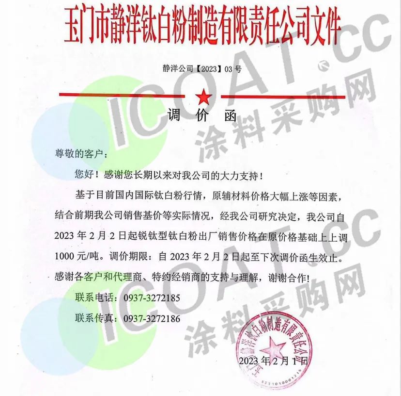 玉門市靜洋鈦白發(fā)布調(diào)價函,稱自2023年2月2日起,銳鈦型鈦白粉出廠銷售價格在原價格基礎(chǔ)上上調(diào)1000元/噸。