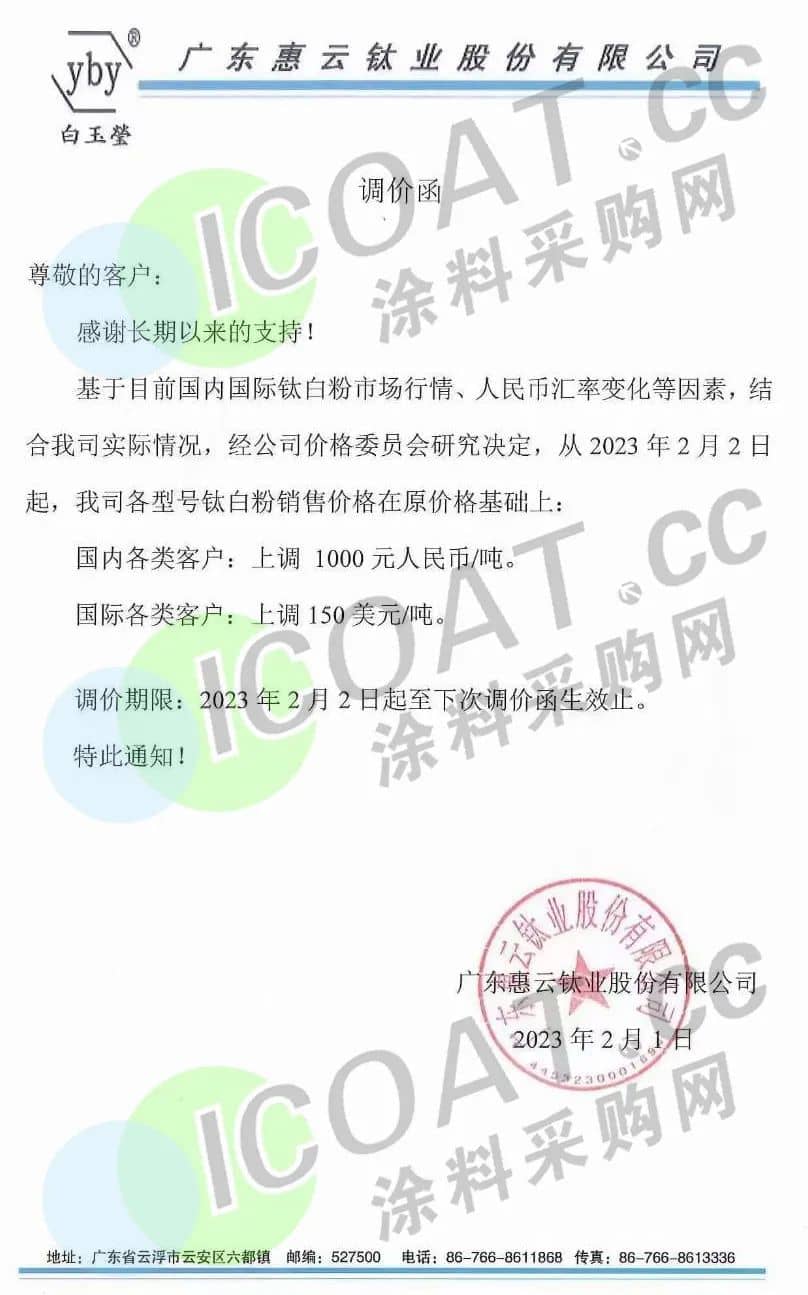 惠云鈦業(yè)發(fā)布調(diào)價函,稱從2023年2月2日起,各型號鈦白粉銷售價格在原價格基礎(chǔ)上:國內(nèi)各類客戶上調(diào)1000元/噸,國際各類客戶上調(diào)150美元/噸。