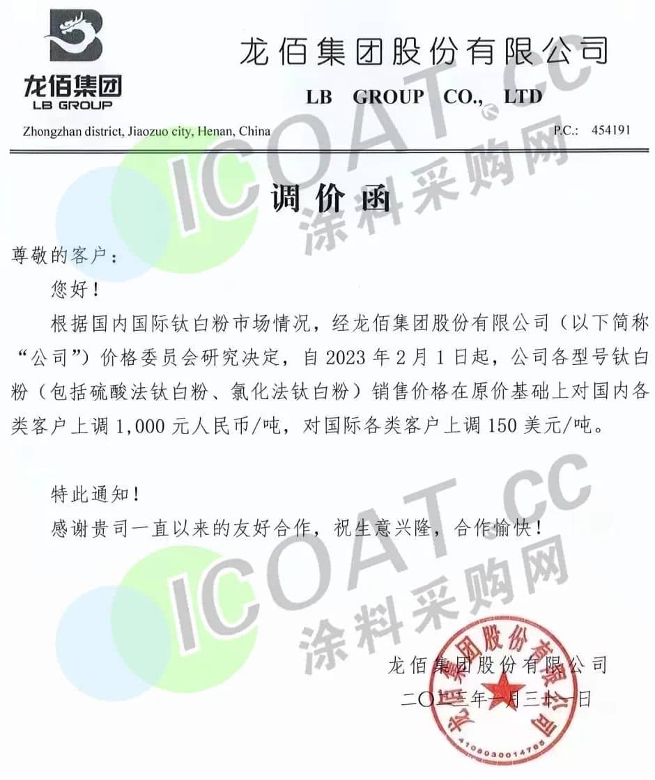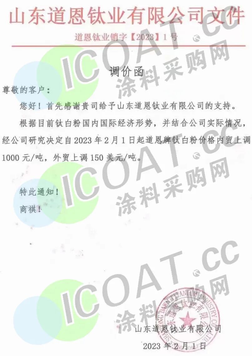 山東道恩鈦業(yè)發(fā)布調(diào)價函,稱定自2023年2月1日起,道恩牌鈦白粉價格內(nèi)貿(mào)上調(diào)1000元/噸,外貿(mào)上調(diào)150美元/噸。